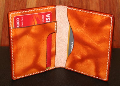 This is my SlimLine Bifold. You're going out to dinner and you don't need everything that's in your other wallet. Make this your everyday wallet. Everything that you need right at your fingertips. Made from 2/3 oz. full-grain veg-tan leather. 4 card slots. Hand stitched with waxed polyester thread, hand burnished, hand buffed, then sealed with beeswax, then hand buffed again. Burnished edges really make it, Make it your's. Color combos are Red on Tan, Oxblood on Black, Brown on Black, Saddle Tan on Brown. These are not the distressed wallets like my others. You can work the leather to your liking by bending not creasing, but gently bending. All leather products have a break-in period. Through the years, this wallet will develop a rich patina and will have its own character.